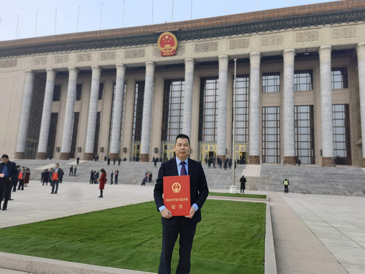11月3日,浙江上洋機械股份有限公司總經理黃劍虹手捧獲獎證書在北京人民大會堂門口拍照留影——公司與安徽農業大學等單位聯合申報的《綠茶自動化加工與數字化品控關鍵技術裝備及應用》獲得國家科學技術進步獎二等獎!