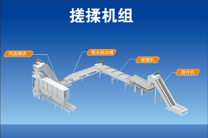 機組組成:本機組由提升機、搓揉機、割末振動槽、風(fēng)選機、機組集成控制系統(tǒng)組成。